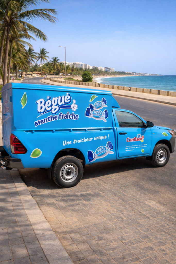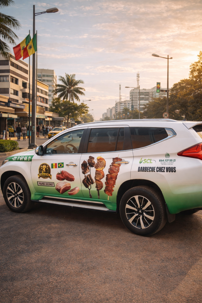 Marquage publicitaire réalisé en vinyle adhésif standard, idéal pour la communication sur véhicules surface plate (voitures, utilitaires, bus).